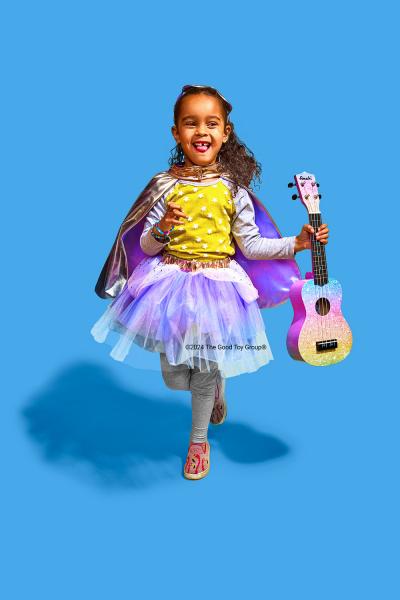 Make memories together with music! Whether strumming away on winter days, gathered together for living room concerts, or singing together inside a pillow fort, Amahi ukuleles set young musicians up for success. This high-quality soprano size ukulele has a glitter rainbow design with a glossy finish on the wood body of the instrument. It features open geared tuners, nylon strings, and comes with a woven nylon zippered carrying bag for on-the-go magical music all year long.