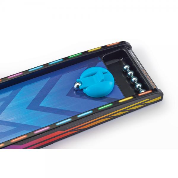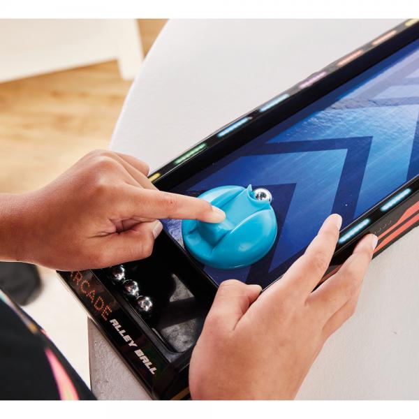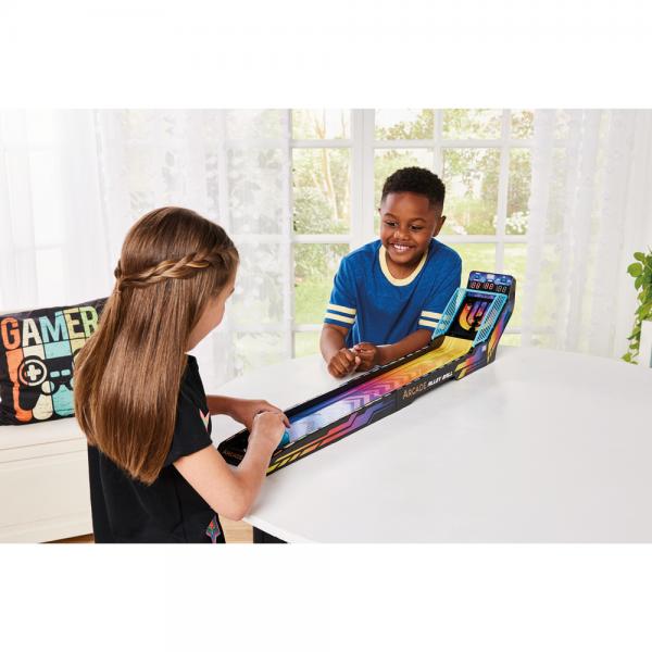 Experience awesome arcade action at home! Roll balls down the 3' track by hand or using the launcher. Land them in a hole to score 1-5 points! The balls roll right back to keep the fast-action fun on target. With electronic sounds, score counter and a 60 second timer, it's classic fun for solo or competitive play. For 1-2 players. Requires 3 AAA batteries, not included.