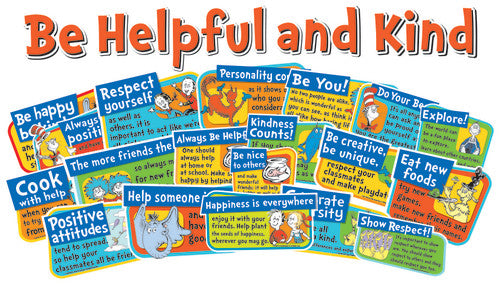 Encourage your students to be kind towards others with this 23 piece Dr. Seuss™ Bulletin Board Set. Set includes 4 panels with: 4 piece Be Helpful and Kind Headers and 19 Motivational Cut Out.