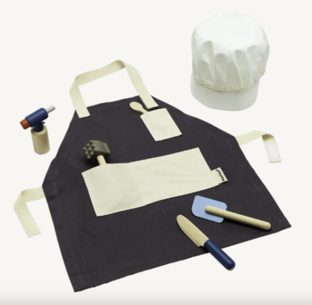 Introduce children to the joy of cooking! The Chef Set includes easy-grip cooking tools that are designed for small hands with big appetites. This set includes 1 adjustable apron, 1 adjustable chef hat, 1 blow torch with a functioning knob, 1 spatula, 1 knife, 1 tasting spoon, and 1 meat tenderizer.