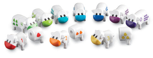 Reinforce number identification, counting, and sorting with these two-piece farm friends. Cows easily snap together and pull apart, reinforcing fine motor skills. Each cow features a number (1–10) on the front with matching spots on the back for easy identification. Color-coding allows for self-checking. An ideal learning toy for ages 2 and up.