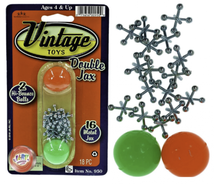 The vintage metal jax game set contains 16 jacks comes with two different colored balls and instructions on how to play. Classic and fun to play on the table. A game for kids and adults.