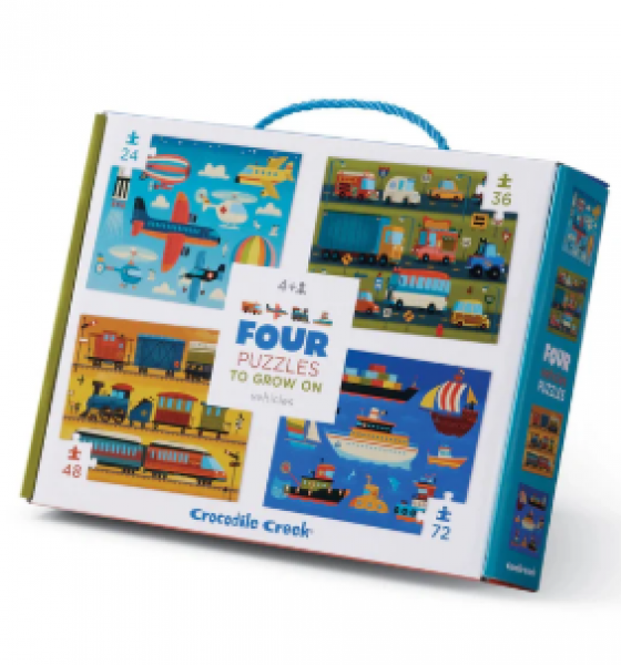 This set of four puzzles from Crocodile Creek lets little ones progress to more difficult puzzles as they grow! The set includes 24-piece, 36-piece, 48-piece, and 72-piece puzzles that are each color-coded on the back for easy sorting. This progressive puzzle set will promote a sense of mastery and build confidence for young puzzlers!
