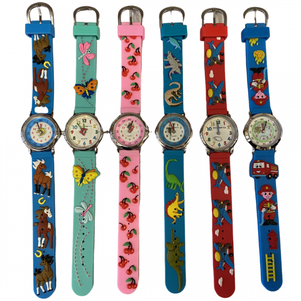 Solo Time USA quartz watches are manufactured to be a fun and a safe way for children to learn to tell time. These watches have a very comfortable band, rotating disc with unique second hand, and a teaching time dial. All watches come with stoppers in them so you will enjoy the full 1-2 year battery lifetime. Battery included. Assorted color bands and themes for both boys and girls.