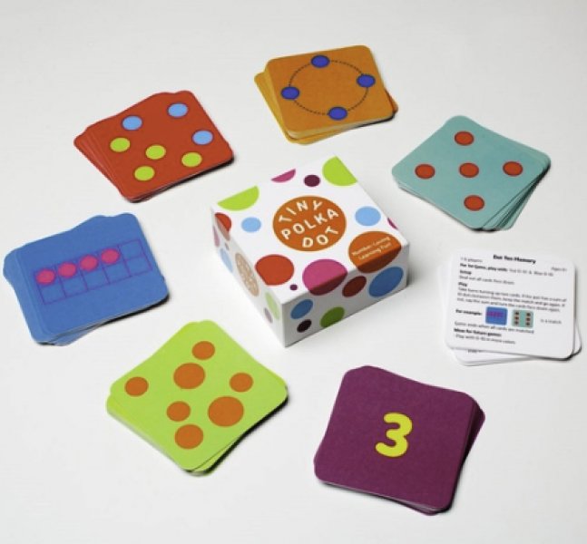 How do you create 16 simple math games with 66 cards? Using tiny polka dots, of course! This unassuming deck comes in 6 "suits" of different colors representing numbers 0-10. Each suit represents these numbers differently: characters, 10-frames, domino rows, different-sized polka dots, etc.