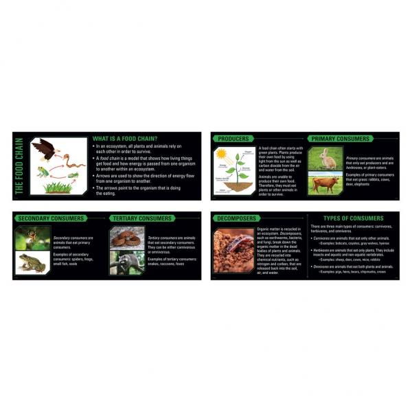 The Ecosystems Whiteboard Topper focuses on the food chain and highlights related academic vocabulary: producers, primary consumers, secondary consumers, tertiary consumers, decomposers, and types of consumers. Each vocabulary word is accompanied by a photo of an everyday object that students can easily identify with. This 8-foot-long whiteboard topper features vivid, engaging photography alongside easy-to-read text to capture students' attention, reinforce instruction, and foster learning. The topper helps bring science content to life and create a stimulating, standards-based classroom environment. Designed to hang above a whiteboard or bulletin board, it can also be hung in a hallway, in the library, or anywhere students study! Perfect for elementary school GATE programs, plus middle school and high school classrooms. Whiteboard topper measures 96” x 8¾”.