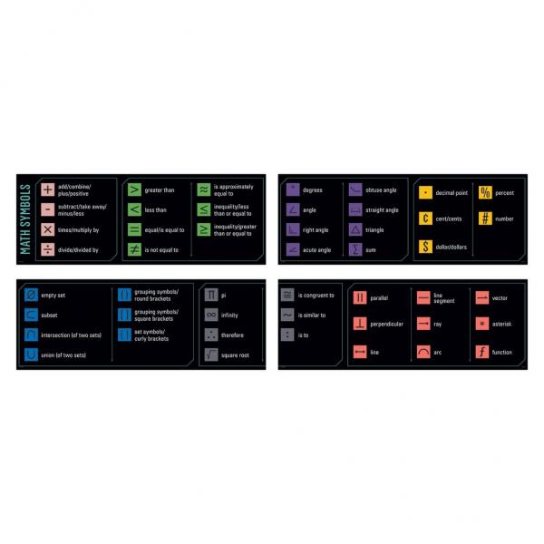 The Math Basics Whiteboard Topper highlights 47 math symbols. Post the whole topper or just the pieces you need! This 8-foot-long whiteboard topper features a clear visual representation of each math symbol alongside easy-to-read text to capture students' attention, reinforce instruction, and foster learning. This learning resource provides a concise reference, and helps create a stimulating, standards-based classroom environment. Designed to hang above a whiteboard or bulletin board, it can also be hung in a hallway, in the library, or anywhere students study. A nice visual for math classrooms! Whiteboard topper measures 96" x 8¾”.